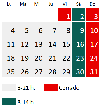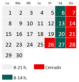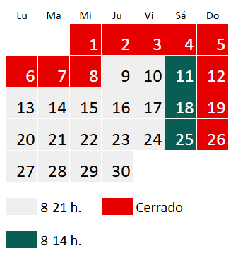 El horario en abril es de lunes a viernes de 8 a 21 h y sábado de 8 a 14 h, a excepción de los siguientes días: