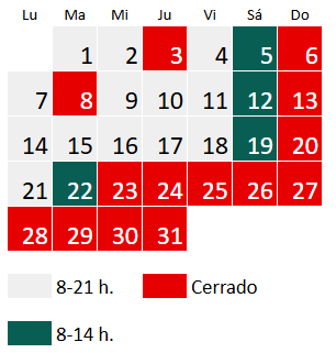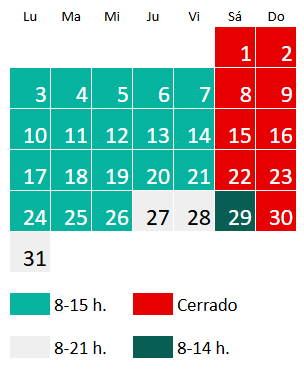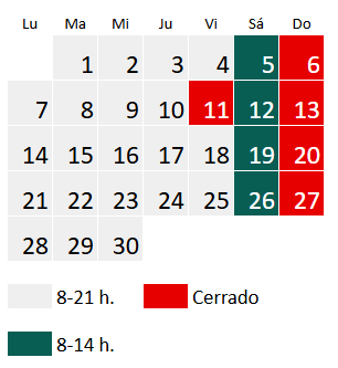El horario en septiembre es de lunes a viernes de 8 a 21 h y sábado de 8 a 14 h, a excepción del siguiente día: