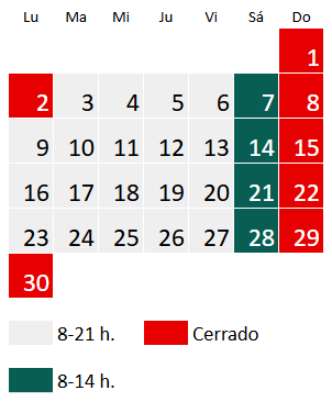 El horario en noviembre es de lunes a viernes de 8 a 21 h y sábado de 8 a 14 h, a excepción de los siguientes días: