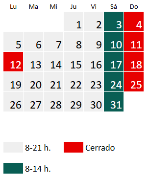 El horario en octubre es de lunes a viernes de 8 a 21 h y sábado de 8 a 14 h, excepto el siguiente día: