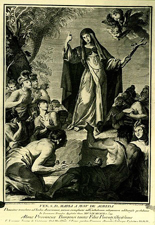 Grabado de Pietro Leone Bombelli de sor María misionera, realizado en Roma en 1761, a iniciativa del postulador de la Causa, con dibujo de Mariano Salvador Maella