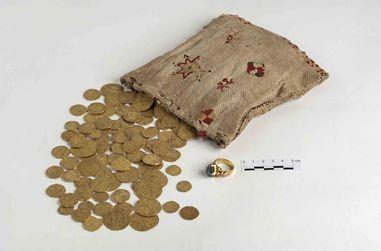 El Tesoro de Pamplona fue hallado dentro de una escarcela mudéjar y una bolsa del siglo XIV en 1940, y fue incluido por Mateu y Llopis dentro de un artículo general sobre “Hallazgos”, en la revista Ampurias en 1945. Posteriormente, salvo las referencias de Adquisiciones del MAN (Madrid, 1947) y la aportación de mi buena colega la malograda Mercedes Rueda en su libro sobre florines, poco más se ha escrito. Actualmente está en espera de publicarse la exhaustiva catalogación efectuada por Mar Gómez Talavera en 1999. Se compone de 117 piezas de oro, de diversas procedencias y cecas, Aragón, Tortosa, Perpiñán, Valencia, Zaragoza, Sevilla, Venecia, Francia e Inglaterra. Su peso es de 374,55 g. Junto a este abultado lote de monedas se hallaba una hermosa sortija del mismo material con una piedra azulada. Se trata indudablemente de un tesoro escondido por su dueño, presumiblemente un peregrino de Santiago.
