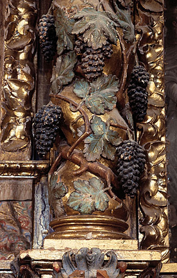 En algunos platos limosneros del Quinientos, importados de Europa, también figuran racimos tanto en decoración como en historias. Será en el siglo siguiente, cuando la presencia de las vides se propagó en proporciones nunca vistas. Así, las encontramos en las columnas salomónicas, durante la segunda mitad del siglo XVII, en un primer momento, en los sagrarios y templetes destinados a la reserva y exposición del Santísimo Sacramento, por obvios motivos de significado eucarístico. Pero muy pronto pasarían a vestir los órdenes de columnas de los retablos. Particular belleza presentan ejemplos en los que uvas, pámpanos y hojas de parra aparecen primorosamente policromadas en sus colores en torno a 1660-1690, pues a fines de siglo se comenzaron a dorar las columnas y todos los motivos decorativos, eliminando todo color y perdiendo mucho la percepción de los distintos elementos. Destacaremos un par de ejemplos sobresalientes. En primer lugar, el retablo del Yugo de Arguedas, obra de Pedro Biniés y José Serrano (1679) con policromía de Francisco de Plano (1684), para la que pidió expresamente que “columnas con campos dorados y uvas y pámpanos imitados a lo natural”. En el retablo encontramos oro limpio en gran parte de sus elementos, junto a color y labor de garfio. Así, destacan los azules y rojos en las cartelas, combinados en sus caras y enveses, más una sinfonía de distintos tonos en las brevas, granadas, alcachofas, uvas, pámpanos y hojas de parra que se distribuyen en las estructuras del retablo. Algo similar, aunque sin tanto detalle, podemos observar en el retablo mayor de las Clarisas de Estella, obra de Juan Barón Guerendiain y del dorador Juan Andrés de Armendáriz (1678). Ángeles tenantes y rodeados de pinjantes de frutos y enormes racimos de uvas aparecen en el retablo mayor de Los Arcos (1655-1677).