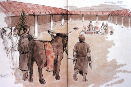 A este sacrificio le precedía una procesión con música, seguida de los adoradores de la diosa Cibeles, figurando en primer lugar los destinados a participar en el taurobolio. Estas curiosas prácticas debieron de pervivir en la villa de Arellano hasta el siglo V, pues la aristocracia que moraba en ella fue la conservadora de los valores religiosos tradicionales quizá como reacción a la política de los emperadores cristianos.