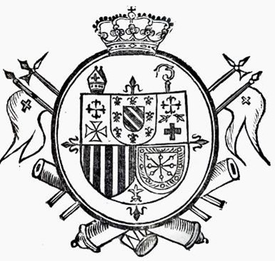 cortado y medio partido: el 1º de plata, sobre el todo el del Cister, acantonado por las cruces militares de Calatrava, Alcántara, Temple (¡ ?) y Montesa, el 2º palado de oro y gules, que es de Aragón, el 3º de gules, a la cadena de oro, que es de Navarra; en punta, lis dorada sobre azur.