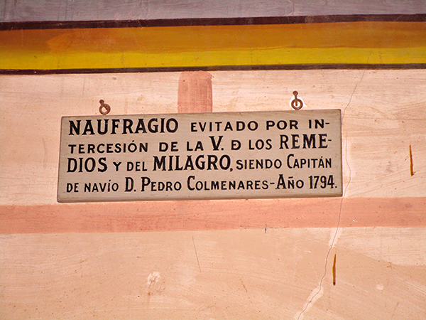 Actualmente, la intervención para salvar milagrosamente de una deriva fatal del navío comandado por don Pedro Colmenares, en 1794, se testimonia por una de las pinturas del crucero de la basílica, seguramente repintada en 1920 por Blas Usechi. Sin embargo, aquel hecho se hacía presente, en tiempos pasados, con más fuerza, porque el interior del templo acogía algo mucho más material y, por tanto, de mayor trascendencia: nada menos que una reducción en madera de aquel navío salvado de las aguas marinas.