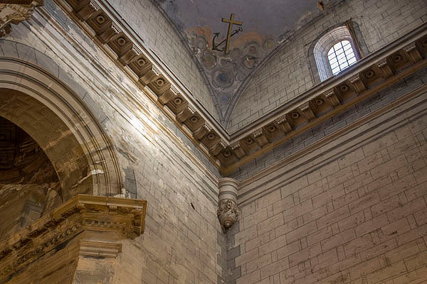 El interior del templo lerinés se caracteriza por la solemnidad y la gravedad de sus dimensiones y decoración manierista. De unos 25 metros de altura, los muros de la nave central quedan articulados mediante grandes pilastras de capitel compuesto y fuste almohadillado apoyadas sobre columnillas y ménsulas medievales que corresponden a cada uno de los tramos. Sobre ellas discurre un rico coronamiento formado por un arquitrabe, friso y cornisa muy volada que se prolonga por los muros de la nave central, crucero y capilla mayor. Por su parte, el cuadrado central del crucero queda remarcado por cuatro grandes machones decorados con potentes pilastras de capitel compuesto y fuste almohadillado. Tanto los muros como las bóvedas de la nave y crucero presentan una decoración pictórica en tonos grisáceos. En los muros se reproduce una labor de mampostería mientras que en las bóvedas se finge un cielo al que se superponen en el crucero.