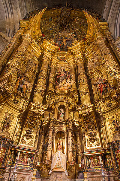 De estilo rococó, el retablo es obra señera del maestro calagurritano Diego de Camporredondo quien el 24 de junio de 1759 se hizo cargo del proyecto comprometiéndose a finalizarlo en un plazo de tres años por 4.600 pesos flojos. Este retablo, de gran altura, tiene forma de exedra semicircular adaptándose a la cabecera renacentista de la iglesia. Se organiza en sotabanco, media caña y banco con cuatro grandes ménsulas en las que apean cuatro columnas de orden gigante y capitel compuesto que dividen el cuerpo principal en tres calles. Sobre las cuatro columnas discurre una cornisa volada. Remata el conjunto un gran cascarón. Del retablo cabe mencionar el rico sagrario-expositor que forma un auténtico retablo dentro de esta maquinaria barroca. Sobre el expositor, que acoge la imagen medieval de la Virgen de la Blanca, se sitúa un templete con la efigie de Santa Bárbara, copatrona de la localidad. A ambos lados del sagrario-expositor destacan dos templetes laterales otrora acompañados por sendas credencias. En la calle central destaca la imagen de la Asunción flanqueada por las imágenes de San Pedro y San Pablo en las calles laterales. Finalmente, el ático se emplaza el Calvario. Este retablo sobresale por la potencia y protagonismo de la arquitectura y por la delicada ornamentación rococó extraída en gran parte de grabados del momento.