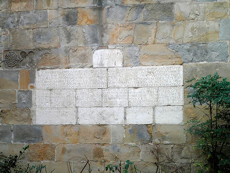 AL BIENAVENTURADO IGNACIO DE LOYOLA, NOBLE GUIPUZCOANO, QUE DESPUÉS DE RESISTIR CON EXCEPCIONAL VALENTÍA EL ASEDIO DE LOS FRANCESES, HERIDO EN AMBAS PIERNAS DURANTE LA DEFENSA DE ESTA FORTALEZA, CAYÓ MORIBUNDO, PERO RESTABLECIDO, PROVIDENCIALMENTE REALIZÓ OBRAS DE PENITENCIA, Y CON LA OPOSICIÓN DE CASI TODO EL MUNDO, PERO CON LA AYUDA DIVINA, FUNDÓ LA COMPAÑÍA DE JESÚS PARA EL BIEN DE LA IGLESIA.
