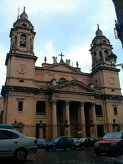 La fachada de la catedral de Pamplona constituye uno de los mejores ejemplos de la nueva arquitectura académica que, poco a poco, durante la segunda mitad del siglo XVIII, fue desplazando al gusto barroco tan arraigado en la sociedad española. Su importancia radica en que fue proyectada por uno de los mejores arquitectos españoles de la época, Ventura Rodríguez. Sustituyó a la vieja portada de la catedral románica, que había logrado perdurar hasta entonces. Cien años antes de su derribo el padre Alesón la calificaba como “tosca y deslucida, estimada sólo por la grande antigüedad que demuestra”, si bien no es hasta el episcopado de Gaspar de Miranda y Argáiz (1742-67) cuando se menciona por primera vez la necesidad de construir un nuevo frontispicio. Los donativos de varios canónigos serán los que impulsen definitivamente al cabildo a aprobar su realización en 1782. Se enviaron al examen de la Real Academia de San Fernando varios diseños de artistas locales, encargándose de las gestiones uno de los capitulares, Felipe García de Samaniego, residente en la Corte y académico de honor de dicha institución. Él y Antonio Ponz, el conocido autor del Viaje de España, fueron los verdaderos responsables de la deriva que tomó el asunto: se rechazaron los planos remitidos desde Pamplona, Ventura Rodríguez fue elegido para trazar el proyecto y Santos Ángel de Ochandátegui para ejecutarlo. Las obras se iniciaron en 1783 y se prolongaron hasta 1800.