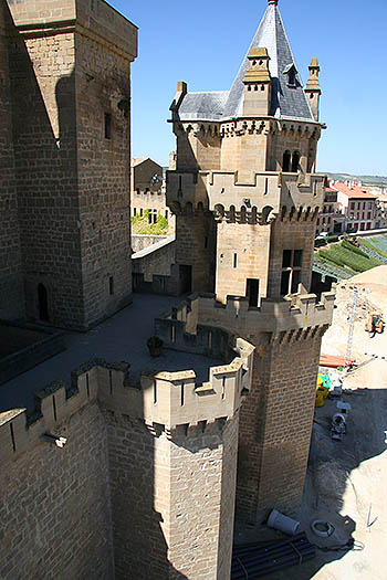 Una de las últimas intervenciones de gran calado emprendidas por Carlos III consistió en la edificación de nuevas estancias cercanas a la Gran Torre pero independientes de ella. El aspecto escalonado y la planta octogonal de la Torre Ochavada, que recibió siglos más tarde el nombre de Torres de las Tres Coronas, han llamado la atención. La presencia de una chimenea y de un habitáculo junto a su entrada lleva a pensar en un uso residencial por parte del soberano. Sabemos que el interior de la torre estuvo revestido de madera en suelo y paredes, fruto del trabajo del carpintero francés Estevenin le Riche. Por el exterior, sorprende la superposición de pasajes almenados, como si fuera un castillo en miniatura. La planta y el revestimiento traen a la memoria las torres de esquina de la Grand Tour de Vincennes, el palacio edificado en el extrarradio de París por los reyes de Francia durante la segunda mitad del siglo XIV, que Carlos III conocía a la perfección a causa de sus repetidas estancias en la capital francesa. Es posible que el monarca, consciente de que los acontecimientos conflictivos de 1410 hacían muy difícil su regreso a París, hubiera deseado evocar mediante esta torre las estancias de los palacios parisinos que tanto admiraba.
