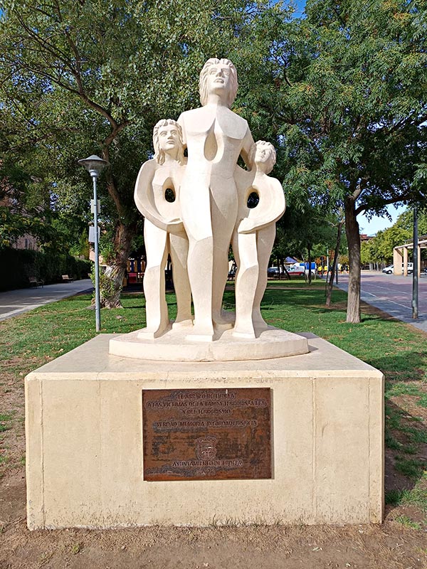 La obra escultórica, con una altura superior a los dos metros, se eleva sobre un pedestal y se integra en el paseo urbano del Queiles como un recordatorio visible y cercano. Ejecutada en piedra artificial, representa a tres figuras, una madre y dos hijos, que caminan juntos y abrazados, sosteniéndose mutuamente para no desfallecer. El gesto es sencillo, pero profundamente expresivo: el abrazo como símbolo universal de apoyo, consuelo y unidad. La elección de la familia como motivo no es casual, por cuanto en el ámbito del terrorismo el sufrimiento se vive en primera persona, pero repercute también en el núcleo familiar y en toda la comunidad. El escultor logra, con una composición compacta, transmitir tanto el dolor y la vulnerabilidad como la resistencia y la fortaleza. La estilización de las formas y la apertura de oquedades evita un realismo excesivo y sitúa la obra en un terreno simbólico. El uso de líneas curvas y de un volumen compacto refuerza la idea de cohesión, mientras que la ausencia de detalles anecdóticos abre la interpretación a todos los espectadores, no remitiendo a un caso concreto sino a la universalidad de las víctimas. En el pedestal queda la inscripción: “‘El abrazo de Tudela’ a las víctimas de la banda terrorista ETA y del terrorismo. Verdad. Memoria. Dignidad. Justicia. Ayuntamiento de Tudela 2021”. Con un monumento convertido en símbolo colectivo, Tudela ofrece un espacio de memoria que no solo honra a las víctimas, sino que invita a toda la comunidad a mantener vivo el compromiso con la justicia y la convivencia.