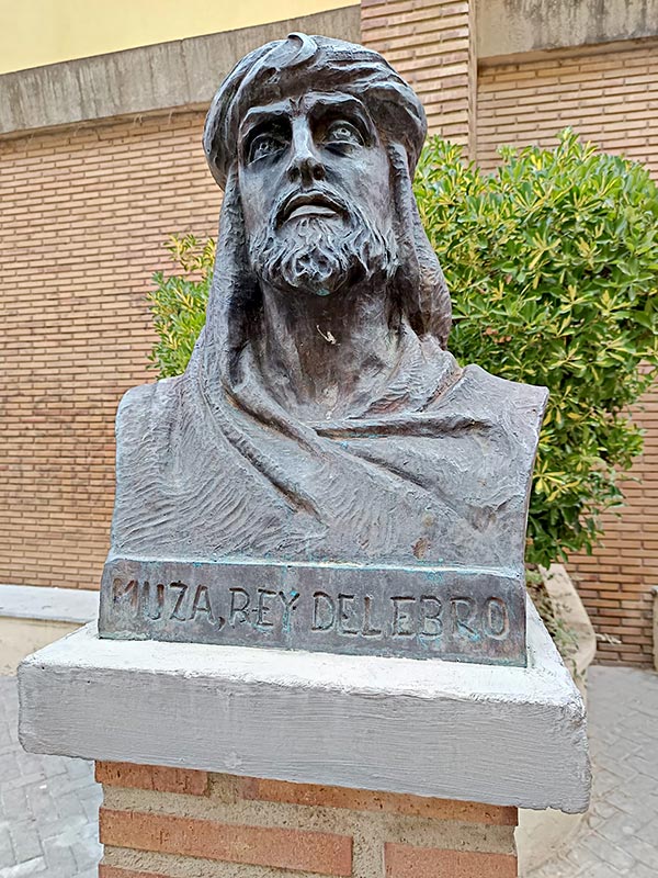 El 28 de septiembre de 1996, el alcalde de Tudela, Luis Campoy, recibía oficialmente el busto en bronce del moro Muza ibn Muza, también conocido como “el Grande”, fallecido en Tudela el año 862 a consecuencia de las heridas provocadas por las tropas del gobernador omeya de Guadalajara. Fue un destacado jefe muladí de la familia Banu Qasi que controló una gran parte de la Marca Superior de al-Ándalus durante el siglo IX y contribuyó a la creación del Reino de Navarra, llegando a denominarse tercer rey de España, frente al rey de Asturias y al emir de Córdoba con los que configuraba los tres grandes poderes de la época. La escultura se integra en un tríptico junto con las de Benjamín de Tudela (1994, Ricardo Varela) y Carlos III el Noble (1999, Pedro Jordán), promovidas por el Rotary Club de la capital ribera con el propósito de visibilizar la convivencia de las tres culturas en la ciudad medieval. De este modo, los tres bustos no solo conmemoran a otros tantos personajes históricos, sino que funcionan como narración urbana sobre la diversidad cultural que configuró la identidad local, incorporando en el caso de Muza la herencia islámica al imaginario urbano.