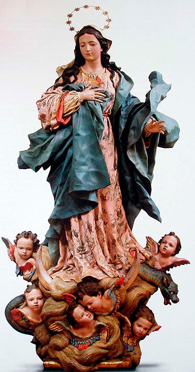 Firmada en la peana por Luis Salvador Carmona ésta escultura de carácter rococó se encuentra recogida en un templete que permite su entera contemplación. Su tamaño es menor que el natural. Representa a La Virgen en pie sobre una base de nubes plateadas y cabezas de ángeles que pisa con un pie una luna creciente, con el otro la serpiente que porta una manzana en su boca. Cruza el brazo derecho apoyando su mano sobre el pecho mientras extiende el izquierdo queda extendido sosteniendo el manto (de color azul y envés verdoso) con la mano abierta de forma dispensadora. Lleva una túnica blanca con rameados que imitan la seda, que se sujeta con un ceñidor carmín a la cintura. También es carmín el envés de la túnica que contrasta con el jubón blanco interior del que se ven el cuello y los puños abotonados. Todo el tratamiento del cuerpo posee un brillo muy rococó. La cabeza se ladea dejando el cabello, largo y oscuro, suelto, cubierto parcialmente por un velo blanco y coronada por doce estrellas. El rostro despejado es de gran belleza, con cejas arqueadas, ojos de cristal con párpados bajos, nariz correcta, boca menuda y, otros elementos modelados con blandura.