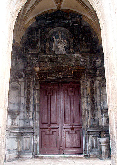 La portada principal se abre a los pies de la nave en estilo barroco realizada en piedra gris oscura, realizada entre 1731 y 1737, como la nave. Consta de basamento, un cuerpo articulado por pilastras cajeadas con pendientes de frutos que rodean una puerta adintelada. Se encuentra enmarcada por un baquetón con orejetas y rematada en un gran tarjetón central. Sobre esto descansa un friso con triglifos y una hornacina con la escultura en madera de San Martín. La portada se cobija bajo el cuerpo interior del fuste de la torre, que se encuentre cubierto por tres arcos apuntados. La cubierta es una bóveda estrellada del siglo XVI que incorpora la inscripción: “ME COLOCARON AÑO / DE 1736”.