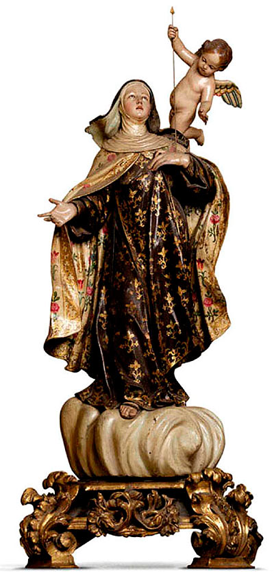 La santa aparece sobre rica peana de hojarasca y nube, en contraposto y en actitud visionaria. Viste ricos hábitos policromados a base de rameados de vivos colores, realizados a punta de pincel, especialmente cuidados en la orla del manto. A diferencia con otros ejemplos, en este caso no encontramos rastro alguno de sus atributos como escritora. La diagonal formada por su brazo derecho extendido y el angelito asaeteador, semiarrodillado sobre su hombro izquierdo contribuye a aumentar los efectos de la retórica propia de las visiones barrocas.