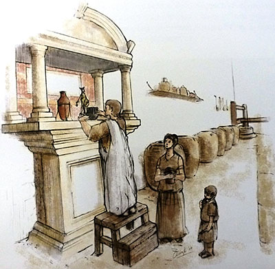 En el muro oriental de la bodega se encontró un larario, pequeño altar de piedra rematado por un tejadillo en el que se celebraban, dentro del ámbito doméstico ceremonias religiosas en las que el jefe de familia actuaba como sacerdote. Los lares, de ahí la denominación de larario, eran los dioses protectores de la casa y de la familia, aunque también existían otros como los penates, protectores de la despensa o los manes que representaban a los antepasados.