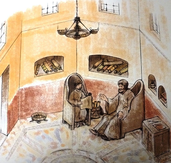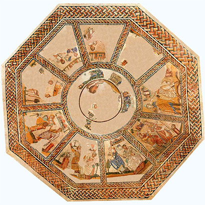 La belleza y la perfección técnica que alcanzaron algunas composiciones en época romana las hizo merecedoras del nombre de mosaicos. Una denominación que proviene del término opus musivum, obra inspirada por las Musas. Un magnífico pavimento con decoración figurada es el emblemático mosaico de las Musas, actualmente en el Museo Arqueológico Nacional, que decora una estancia de planta octogonal identificada como el musaeum, lugar destinado al estudio y actividades intelectuales. Presenta un emblema central circular rodeado de nueve compartimentos radiales en los que figuran cada una de las nueve Musas acompañadas por un “maestro” denominación que hace referencia a poetas, filósofos o personajes consagrados a actividades intelectuales.