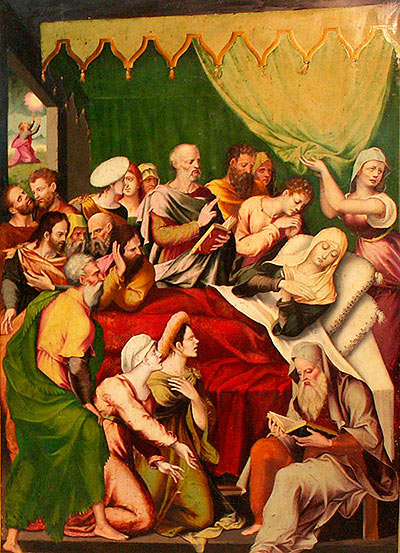 En la tabla central del retablo se representa el tema de la Dormición de la Virgen, cuya composición se complica, con la presencia de una multitud de figuras, los Apóstoles y sirvientas, rodeando a María yaciente. Los personajes se disponen alrededor del lecho pero dejando que destaque la figura de la Virgen. Para acentuar ese efecto se eleva el lecho al tiempo que se hace descansar el cuerpo de María en altos almohadones de decorados bordes.