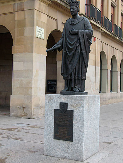 La escultura, fundida en bronce a la cera perdida, representa al monarca en pie, en actitud de entregar el Privilegio de la Unión que porta en su mano derecha, en tanto que dobla la izquierda hacia el pecho con gesto solemne. La imagen se eleva sobre un pedestal de granito que incorpora una placa en bronce con el escudo de Pamplona y una inscripción en castellano y euskera relativa al personaje y acontecimiento conmemorados.