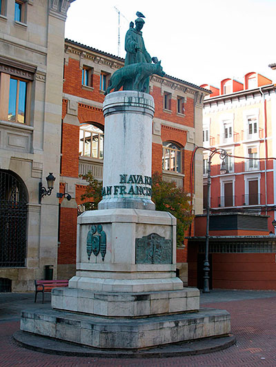 El proyecto correspondió al escultor pamplonés Ramón Arcaya, sobre el que introdujo ciertas modificaciones el arquitecto J. Alzugaray. Erigido inicialmente en el centro de la Plaza de San Francisco, sobre una peana muy diferente a la actual, los elementos que componían el conjunto participaban de una simbología que relacionaba al santo con la ciudad. En 1993 fue desmontado y acercado a las Escuelas Municipales, emplazamiento que le permite conectar visualmente con dos de los ámbitos urbanos más representativos de la ciudad como son el Paseo de Sarasate y la Calle Mayor.