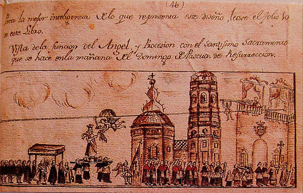 Grabado de la bajada del Ángel y el volatín en Tudela de J. A. Fernández en “Libro nuevo de la hermandad”