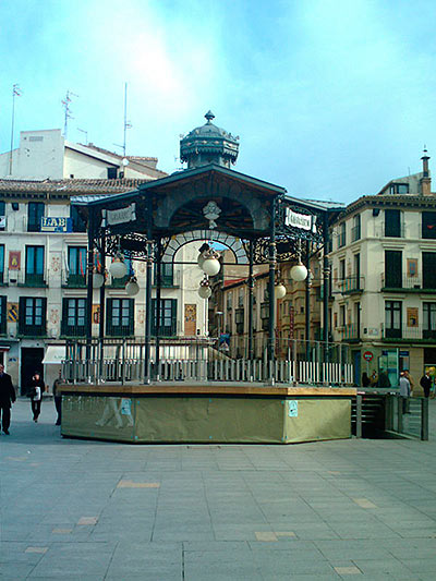 Sobre 1885 se instaló en el centro de la plaza una gran fuente procedente de Londres formada por una bandeja circular en la parte baja, cuatro niños que portaban barriles de donde salía el agua y con dos bandejas en sus cabezas por las que se derramaba el agua en cascada. Como remate un farol de aceite. Denominada la “Fuente de los Angelotes” se sustituyó por el actual quiosco poligonal en 1921 y trasladada al Paseo Vadillo. El nuevo proyecto fue encargado a Nicasio Martínez y el herraje artístico al maestro cerrajero y herrero Santiago Marsellá. En éste toca la Banda Municipal durante las diferentes festividades y, a causa de varias inundaciones, se le designa coloquialmente como “la pecera”.