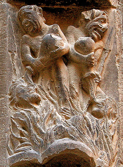 El castigo de los que se exceden en la comida y la bebida aparece representado mediante dos personajes desnudos a los que sendos diablos dan de beber un líquido de fuego. Igualmente, en otra dovela, dos personajes en una caldera parecen beber del líquido que cae de dos copas sujetas por diablos. Este castigo es descrito de forma similar en los hadices musulmanes (textos que narran la visita de Mahoma al infierno y al cielo) como el castigo para los bebedores de vino. Además, B. Mariño cita como paralelos literarios un relato del siglo XIII, donde se cuenta el castigo a un noble en el infierno al que se obligó a beber ascuas de una copa, o la predicación de un monje inglés que en el siglo XIV que amenaza a los glotones con una copa de fuego y azufre.
