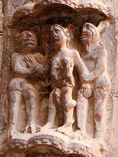 Es uno de los pecados más representados en Tudela, y en general en el arte medieval. Entre los castigos de la lascivia podemos distinguir la representación tradicional de la lujuria en una mujer atacada por reptiles en los pechos y los genitales, a la que unos diablos enseñan un espejo, atributo de la lujuria pero también de la vanidad y el orgullo. Pero en Tudela no se limita la lascivia a esta representación tradicional, sino que se diversifican las representaciones de pecados en relación con ella y los castigos correspondientes. El adulterio esta presente en la pareja a la que un demonio enseña un espejo, y que en la dovela superior se queman en una marmita. La sodomía se castiga mediante un diablo que lleva a dos hombres colgados boca abajo de un palo por los genitales, con lo cual se hace referencia a su carácter de "invertidos" y se mantiene la pauta órgano pecador/órgano castigado que era general en la Edad Media.