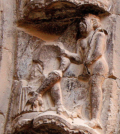 En el lado derecho encontramos en una dovela la figura de Satanás dirigiendo la vida infernal. Sentado sobre un trono, da órdenes a un diablo situado a su lado. La idea de un Príncipe de los Infiernos en constante en toda la literatura relativa al infierno, tanto en los escritos clásicos como cristianos o musulmanes. Además, esta representación de Satanás ordenando supone una copia de la jerarquía celestial, ya que las figuras infernales eran presentadas como una antítesis, un reflejo invertido de lo establecido. Probablemente era esta una figura imponente, como muestran las garras en que acaban sus piernas cruzadas (símbolo del poder y los soberanos en la Edad Media), si bien sólo podemos imaginarlo debido a la destrucción de la parte superior de su cuerpo, probablemente intencionada, como ha sucedido con muchas imágenes diabólicas a lo largo de la historia.