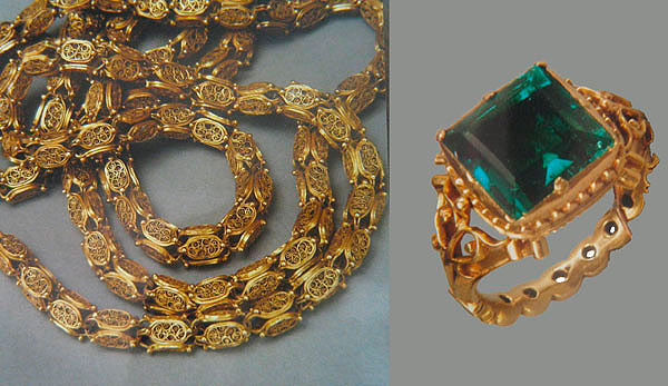Más reducido es el capítulo de joyas integradas en el ajuar del Santo, aunque todas ellas de excelente calidad, que no son sino reflejo de lo que existió, ya que la documentación de la capilla nos habla de numerosas piezas, entre ellos pectorales de oro engastados con rubíes o amatistas, manecillas de perlas, sortijas de oro engastadas con diamantes, esmeraldas o rubíes, o cadenas y cordoncillos. De todo ello sólo ha llegado hasta nosotros la cadena de oro con el pectoral de esmeraldas enviado por don José de Armendáriz en 1730, piezas ya reseñadas en la ficha correspondiente al legado Armendáriz, una cadena de oro regalada en 1757 por don Nicolás de Urtasun, y una sortija con una esmeralda, mandada desde Popayán, actual Ecuador, por don Juan Antonio de Zelaya en 1775.