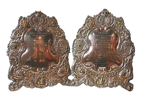 Ambas piezas presentan estampadas la doble marca preceptiva en Pamplona, la de localidad, una doble P coronada, punzón de la capital navarra, y la de autoría, YAVAR, correspondiente con una de las marcas utilizadas por el platero pamplonés José de Yabar (1713-1777), hijo del también maestro Hernando de Yabar (1671-1725), con quien se formó en un primer momento, pasando posteriormente a terminar su aprendizaje en el taller del platero zaragozano José de Godoy, donde estuvo seis años. Este artífice obtuvo el grado de maestro platero en 1728, con el dibujo de una pila de agua bendita, de bello diseño, muy correcta en el trazo y profusamente decorada con motivos vegetales. Utilizó dos tipos diferentes de marca personal, parece ser que indistintamente, sin que una sustituyese a la otra en el tiempo, por un lado una cabeza con yelmo, y por otro su apellido dispuesto en una sola línea y en letras mayúsculas, tal y como figura estampada en las sacras aquí estudiadas. Numerosas son las obras de José de Yavar que han llegado hasta nuestros días, todas ellas religiosas, salvo un azafate de colección particular. Estas sacras fueron realizadas por encargo del ayuntamiento de Pamplona, patrono de la capilla de San Fermín, siendo entregadas en 1774 por el también platero Pedro Antonio de Sasa, quien, casado desde 1772 con una sobrina de Yabar, compartía el taller con dicho maestro. Las sacras tuvieron un coste de mil doscientos noventa y cuatro reales y trece maravedíes, precio en el que también estaban incluidas las hechuras de las piezas y sesenta y siete onzas de plata que se emplearon en su ejecución, no habiéndose conservado el juego completo, ya que falta la pieza central, habitualmente de mayor tamaño que las laterales.