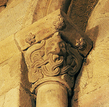 En la fotografía mostramos un bello mascarón animal, quizá un león, de cuyas fauces nacen caulículos vegetales. Se encuentra a la izquierda de la ventana del hastial de la capilla, y hace pareja con otro parecido en la puerta occidental. Realmente está muy conseguido. Y muestra un tema que tendrá gran recorrido en el arte medieval navarro, anunciando ya los green-man góticos.