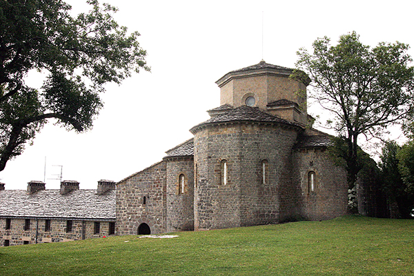 Desde el este, lo primero que llama la atención es la posición del santuario en la ladera. Se construye sobre la misma roca, con los tres ábsides en la parte más elevada del desnivel. Es un edificio compacto y alargado, sin torres ni campanarios, del que sólo destaca en altura el cimborrio, rehecho durante la restauración de los años 70 del siglo pasado.