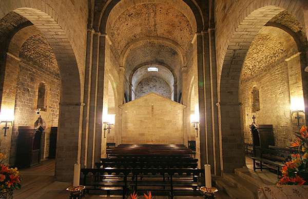 En esta vista hacia los pies del edificio, constatamos la fortaleza de los poderosos pilares cruciformes que delimitan sus cuatro tramos, y soportan las bóvedas de cañón y los formeros de separación de las naves. Formas pesadas, rectas, ventanas sin enmarques moldurados, ausencia de capiteles, en un conjunto arquitectónico que carece completamente de decoración. Estamos contemplando otro románico, más antiguo, más esencial y estructural, más robusto y pesado. Llama la atención la potencia de las bóvedas de cañón, resueltas con mampostería muy irregular. Conservan restos de lucido de cal, que anuncia un interior que en origen iría pintado.