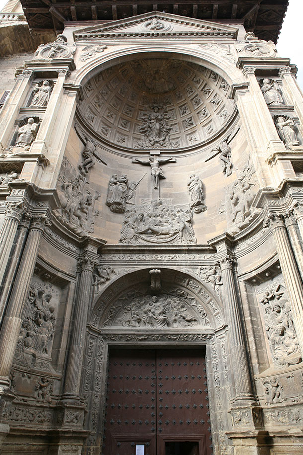 La iglesia de Santa María de Viana cuenta con una magnifica portada escenográfica a modo de caja de retablo, que se articula en torno a una exedra central, que conforma uno de los ejemplos más sobresalientes de la arquitectura renacentista en Navarra. La importancia que esta obra tendrá motivará que su influencia se deje sentir no sólo en obras contemporáneas, como la iglesia parroquial de San Esteban en Murillo de Río Leza en La Rioja, sino que incluso tendrá su eco en obras posteriores, sobre todo en los siglos del Barroco, como podemos ver en las portadas de San Gregorio Ostiense de Sorlada, Santa María la Redonda de Logroño o Santa María de San Sebastián. Esta obra presenta una rica y compleja iconografía, en la que se mezclan temas sacros con otros profanos.