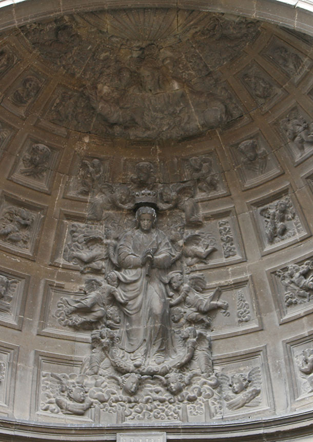 En la bóveda de cuarto de esfera que remata el cuerpo central de la portada, recubierta de casetones que inscriben figuras de angelitos y querubines, encontramos la representación en un mismo grupo de la Asunción y la Coronación de la Virgen. Así, en el eje ascensional de la Sagrada Familia, el Calvario y el Santo Entierro, se coloca la imagen de Nuestra Señora, subida a los cielos por las figuras de varios ángeles, con los pies sobre la media luna, apoyada en una gloria de nubes, marcando de esta forma el hecho de que la Virgen no ascendió a los cielos por sus propios medios, sino que fue llevada por ángeles. La imagen viste túnica de pliegues en uve, con la rodilla flexionada, las manos unidas sobre el pecho en actitud orante y la cabeza inclinada hacía abajo en señal de humildad. Se trata de una iconografía que dará paso a la de la Inmaculada Concepción, con la que se confunde ya en sus formas de representación. En esta imagen vemos cómo al mismo tiempo de su asunción se produce ya su coronación, con dos ángeles que le colocan una corona real, mientras que en la parte superior vemos la figura del Padre Eterno, en actitud de bendecir con la mano derecha y con el orbe en la izquierda, rodeado también e una gloria de nubes y ángeles.