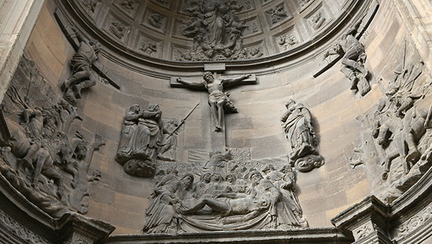 En la parte central del segundo cuerpo se sitúa la escena del Calvario, centrado por la figura de Cristo crucificado, sobre una amplia cruz rematada por la cartela con la inscripción INRI, de tres clavos, de gesto sufriente pero ya muerto, con la cabeza sobre el hombro, larga melena y corona de espinas. Tiene un paño de pureza volado, brazos en uve y anatomía marcada, reflejando la tensión del momento. A su derecha se sitúa san Longinos, dispuesto a atravesar el costado de Cristo con la lanza, y junto a él, el grupo de las Marías, con la Virgen en actitud implorante, mientras es consolada por María Cleofás. Al otro lado, a la izquierda de Cristo, se coloca san Juan, con la mano sobre el pecho, mientras que María Magdalena aparece abrazada al pie de la cruz, en actitud desconsolada, con la melena suelta. En los extremos se disponen las figuras del Buen y el Mal ladrón, Dimas y Gestas, ambos crucificados pero atados con cuerdas, de cuerpos musculados, edad madura y barbados. El primero de rasgos serenos y bellos, mientras que la expresión del segundo refleja ya su condición de condenado. Justo bajo los dos ladrones se representan sendos grupos de soldados, uno de ellos saliendo de una ciudad amurallada, en composiciones prácticamente simétricas, que se pueden identificar como los soldados romanos que vigilaban la crucifixión de Cristo.