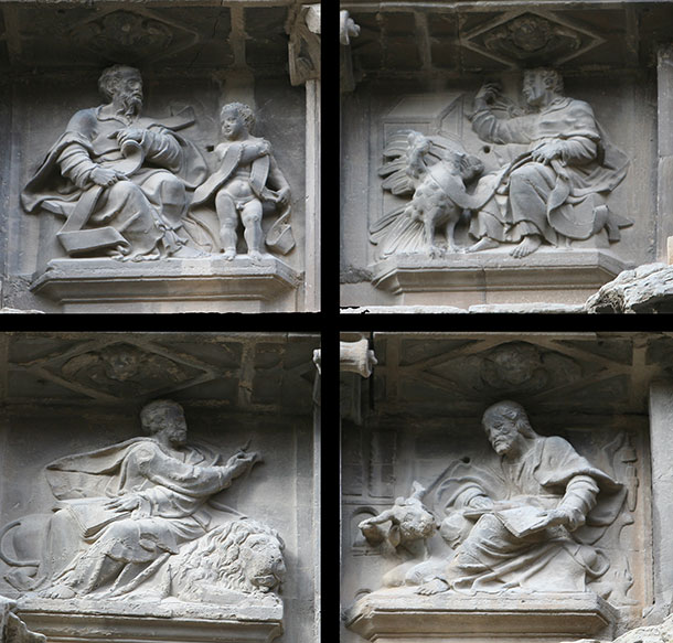 Sobre el friso que cierra el primer cuerpo, en el eje de las dos escenas de la Pasión de Cristo, se disponen unos enmarcamientos rectangulares que inscriben en su interior las figuras de los evangelistas. Sobre la escena de la Oración en el Huerto se sitúan San Mateo y San Juan, mientras que sobre Caída camino del Calvario están la pareja formada por San Marcos y San Lucas. Los cuatro santos se representan sedentes, redactando sus respectivos libros y acompañados por sus atributos iconográficos: el Ángel de san Mateo, el Águila de san Juan, el León alado de san Marcos y el Toro alado de san Lucas, de acuerdo a la visión de Ezequiel y al Apocalipsis de San Juan. Se representan de manera naturalista, con rasgos y gestos individualizados, ajustándose al marco en que se inscriben.