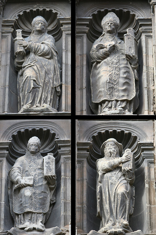 Sobre las figuras de los evangelistas, inscritos en las pilastras cajeadas que enmarcan la exedra, y dentro de hornacinas aveneradas superpuestas, se sitúan los Padres de la Iglesia latina: en el lateral izquierdo San Ambrosio y San Gregorio Magno, y en el derecho las figuras de San Jerónimo y San Agustín. Todos ellos se han representado de forma similar, vestidos de pontifical, con la maqueta de una iglesia en la mano y tocados por mitra, salvo San Jerónimo, que porta el capelo cardenalicio. Así mismo, San Gregorio y San Agustín tienen en su mano derecha un libro, alusivo a su condición de escritores, que sin embargo no portan las otras dos figuras.