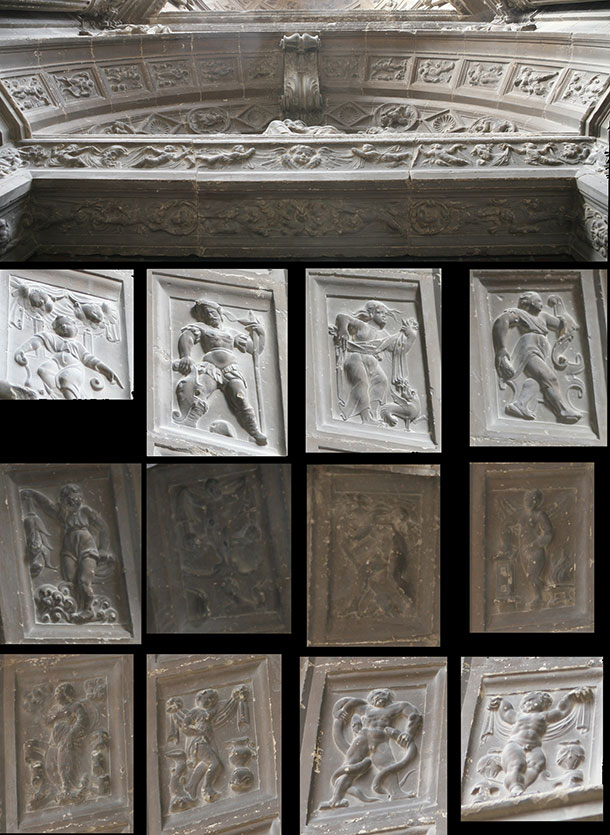 Uno de los elementos iconográficos más curiosos de esta portada lo constituye la sinastría astrológica de los horóscopos del nacimiento y muerte de Cristo, esculpida por Juan Ochoa de Arranotegui en los casetones del intradós del arco de la puerta de ingreso. Esta iconografía, identificada por el Dr. Esteban Lorente, se basa en el comentario de Jerónimo Cardán al Tetrabiblos de Cl. Ptolomeo, publicado en 1554. De esta forma, partiendo del lado derecho, y de abajo a arriba, siguiendo la dirección contraria a las agujas del reloj, vemos representadas en los doce casetones varias constelaciones: 1º Piscis, como un niño sentado en un trono; 2º Marte con el sol a sus píes; 3º la Luna en eclipse, como una mujer con el pelo desmadejado con un dragón a sus pies; 4º Orión, como un guerrero con escudo y maza; 5º Vía láctea como ninfa sobre las aguas, en forma de mujer que sostiene una guirnalda vegetal y tiene los pies sobre las aguas; 6º Géminis?, como mujer desnuda entre querubines y bajo ella un busto femenino; 7º Saturno, como gigante con bastón en la mano y cráneo a sus píes; 8º Berenice, como mujer con la cabeza rapada enmarcada por un ara y una hoguera; 9º Virgo, como una mujer con la mano derecha en el pecho y la izquierda señalando al suelo; 10º la Luna sobre la constelación de Hidra, representada como una mujer que pisa la cola de la hidra, cuyo cuerpo se ha perdido, que tiene la cabeza apoyado en un árbol; 11º Ofiuco, en el que vemos un hombre musculado luchando con dos serpientes; y 12º Acuario, en forma de un niño con dos cráteras, Ganímedes con los jarros del templo de Júpiter, alusión al punto astrológico denominado “La parte de la Fortuna”.