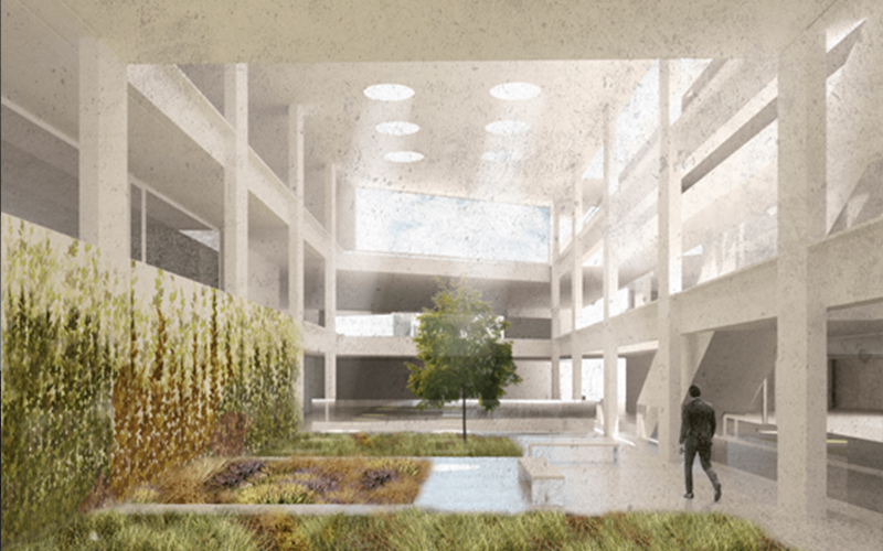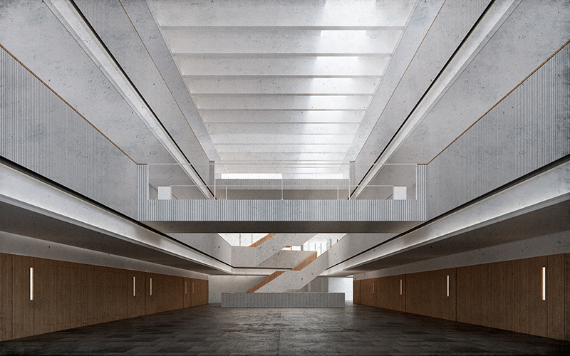 El ágora, concebida como una plaza pública interior, organiza la circulación del edificio y distribuye los espacios docentes, laboratorios y otras instalaciones de investigación. Este gran atrio incluye escaleras suspendidas, que actuarán como puentes que conectan los distintos niveles y zonas de descanso. En él también se ubicará el Centro de Innovación y Emprendimiento de la Universidad de Navarra (Innovation Factory) y un meeting point para estudiantes, con vistas al entorno del campus y a la ermita de la Virgen del Amor Hermoso.
