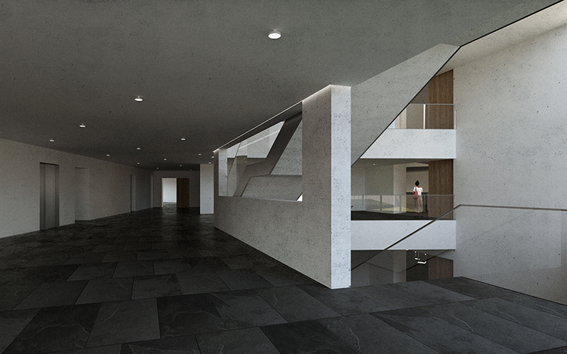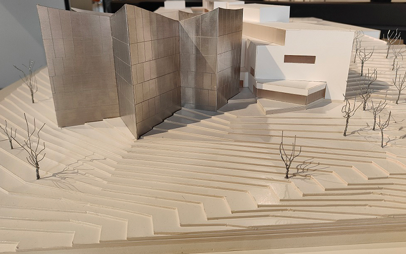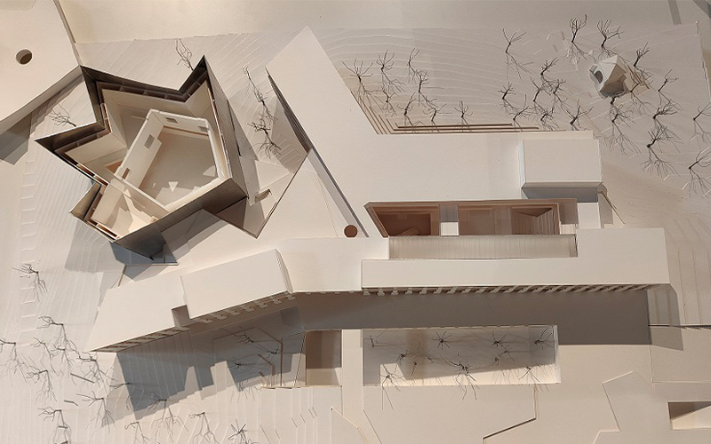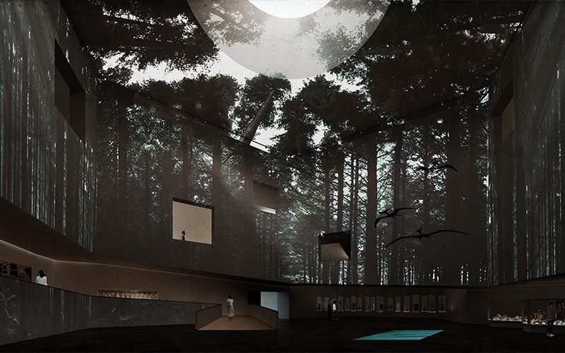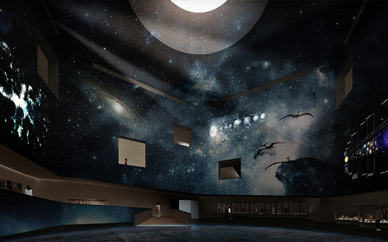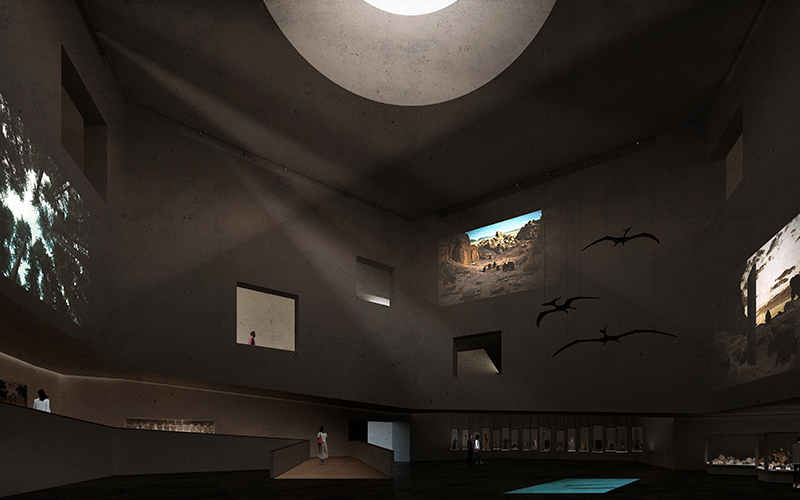 La geoda, núcleo expositivo del Museo de Ciencias, se concibe como una gran “gema” excavada en el paisaje. Su interior gira en torno a un espacio central de 16 metros de altura, rodeado por rampas y plataformas que albergarán exposiciones. Este recorrido permite a los visitantes detenerse y observar las piezas expuestas a lo largo de su trayecto. El espacio principal cuenta con 780 m², complementado con cinco salas-rampa de 530 m².