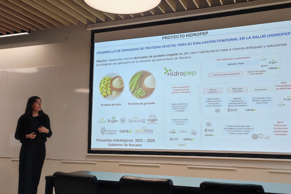 El proyecto HIDROPEP, financiado por la convocatoria de proyectos estratégicos del Gobierno de Navarra (2023-2025), lo integran empresas y centros navarros y tiene como objetivo el desarrollo, la evaluación funcional y la aplicabilidad industrial de nuevos derivados de proteína vegetal. En concreto, la doctoranda ha trabajado en el diseño de snacks ricos en proteína de haba y guisante, así como en la evaluación de los potenciales efectos saludables de hidrolizados de estas proteínas en modelos animales (C elegans y ratones).