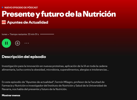 Investigación para la innovación en nuevas proteínas, aplicación de la IA en toda la cadena alimentaria, lucha contra la obesidad, microbiota, superalimentos, alergias e intolerancias... En este episodio de "Apuntes de actualidad", Fermín Milagro, profesor de la Facultad de Farmacia y Nutrición e investigador del Instituto de Nutrición y Salud de la Universidad de Navarra, habla del presente y futuro de la Nutrición en el canal de Spotify de la Universidad de Navarra.