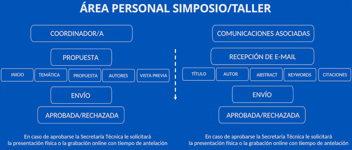 Los resúmenes para la propuesta de simposio/talleres se remitirán mediante el formulario de envío disponible en el ÁREA PERSONAL. Cada simposio/taller incluirá cuatro o cinco comunicaciones orales y tendrá un coordinador que dará la palabra a sus participantes, analizará las principales aportaciones de cada comunicación y, sobre todo, dinamizará un debate final relacionado con el contenido de las comunicaciones.