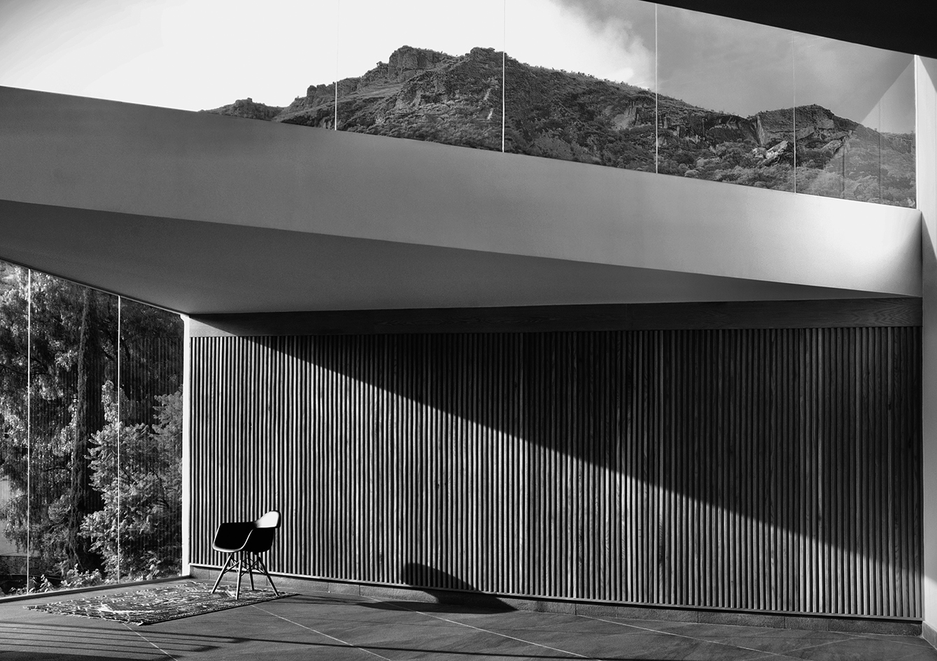 Guanajuato, la ciudad donde se encuentra el despacho, fue nombrada Patrimonio Cultural de la Humanidad en 1988 por su riqueza natural. La delimitación natural Lomas de Zaragoza se encuentra a espaldas del centro histórico, señalada por un macizo rocoso llamado el Cerro de la Bufa que le confiere, por su conformación accidentada, una arquitectura singular. El despacho existente fue construido en las faldas de este cerro de manera que su frente se encuentra orientado hacia la ciudad, mientras que los ámbitos privados y sus vistas se orientan hacia atrás, en las alturas del cerro. Más allá de resolver las sencillas cuestiones programáticas, la estrategia planteada se centró esencialmente en definir el modo de introducir la potente vista de los macizos rocosos en el interior de la oficina para, mediante esa apropiación visual del patrimonio natural local, otorgar valor específico al proyecto. Para ello, se decidió generar una cubierta inclinada que permitiera abrir un vano rectangular hacia la vista y así jugar con las perspectivas y alturas al interior del espacio, produciendo un juego de luces y sombras que va variando durante el transcurso del día. Una materialidad sencilla basada en muros y plafones blancos contrasta con el piso oscuro natural, el cual permite incluir detalles en madera y alojar un mueble de oficina integral de encino especialmente diseñado para satisfacer las necesidades del cliente. Finalmente, incorporando la vista del Cerro de la Bufa, el proyecto cumple con su cometido de crear un ámbito dotado de amplitud, que brinda privacidad y posee carácter.