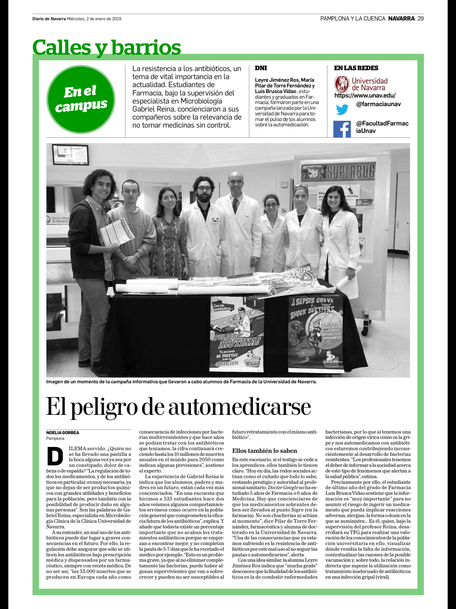 Artículo sobre el peligro de automedicarse publicado en el Diario de Navarra (enero 2019)