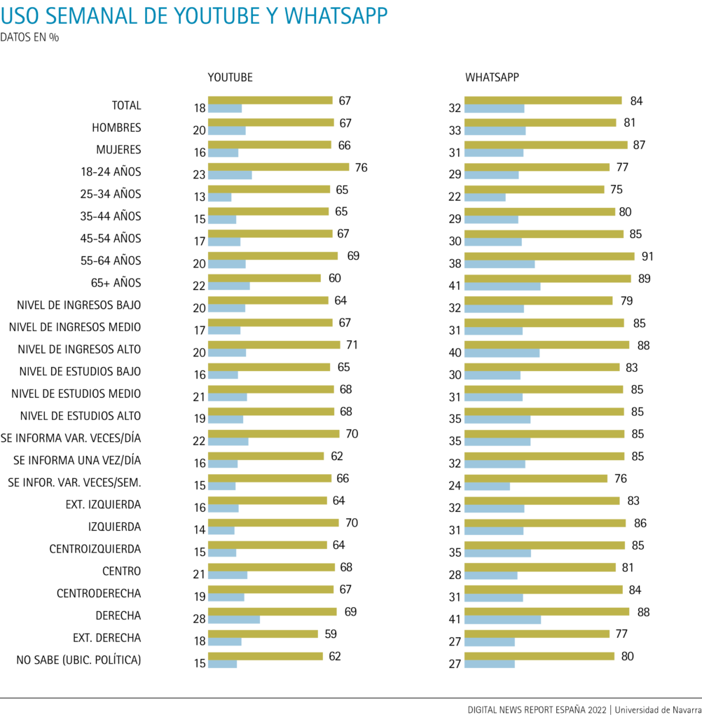 Al reparar en la inclinación política de los encuestados, se percibe que el público que se ubica en la derecha utiliza más los servicios de mensajería instantánea para noticias: cuatro de cada diez (43%). En el caso de WhatsApp, son casi cuatro de cada diez (38%). Los internautas que se declaran de derecha acuden además a YouTube (26%) y lo hacen en mayor medida que el año pasado en el que esta plataforma se ligaba al público del centro político. Igualmente, el consumo de noticias en Telegram continúa enlazándose con los usuarios de derecha, si bien solo en el caso de uno de cada diez (10%). Por tanto, sigue siendo significativo que casi cuatro de cada diez personas situadas en la derecha política consuman noticias en una red de imagen o vídeo (Instagram, YouTube, Snapchat, TikTok o Twitch) (39%).