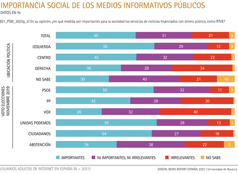 Según el recuerdo del voto en las elecciones generales de noviembre de 2019, para la mitad de los votantes de Ciudadanos (52%), PSOE (51%) y Unidas Podemos (47%), y para el 34% de los votantes del PP, frente al 23% de los votantes de Vox, los medios públicos son importantes (la diferencia es significativa con respecto a los votantes de Vox). Por el contrario, para el 43% de los votantes de Vox y el 32% de los del PP los medios públicos no son importantes. Por debajo de la media (26%), los medios públicos son irrelevantes para el 15% de los votantes del PSOE, para el 21% de Unidas Podemos y para el 21% de Ciudadanos. Por último, para cuatro de cada diez internautas que se abstuvieron (39%) los medios públicos no son importantes, ni irrelevantes.